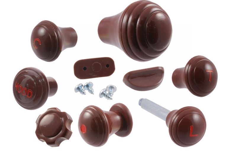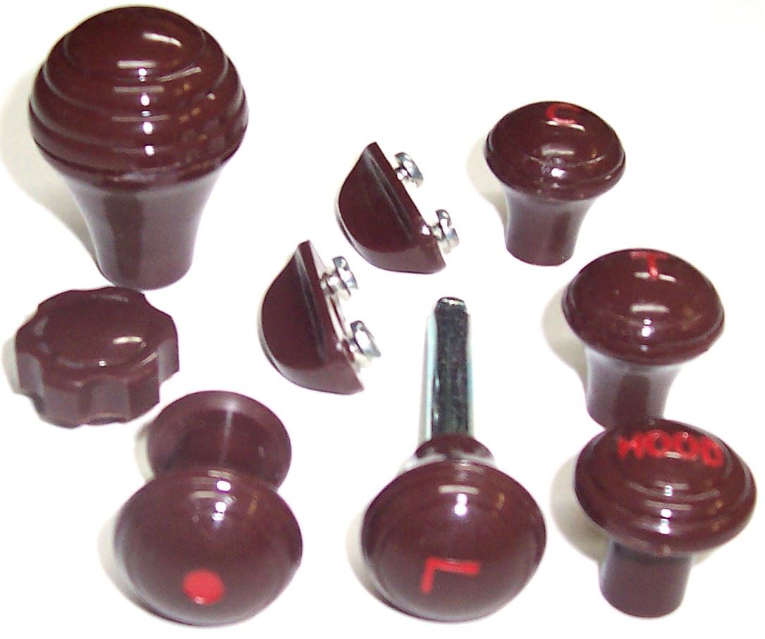 Kit includes: 21A-9703-A choke knob, 21A-9778-A throttle knob, 21A-11661-A headlight knob, 21A-701638-A cigar knob, 21A-701606-A ash tray knob, 21A-16918-A hood pull knob, 21A-17513-A wiper knob & 21A-7213-A gearshift knob. Knobs can also be purchased individually.