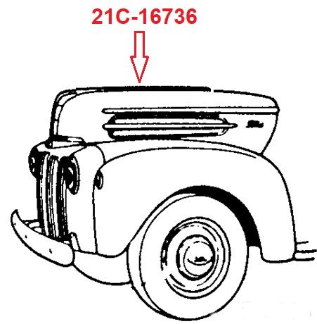 Hood Molding, 21C-16736Center strip, polished stainless steel, 1942-1947 pickup, commercialSKU: 21C-16736Delivery date: 3-5 days $85.00 Qty: Add to cart Custom wishlist OKAdd to wishlistEmail a friendProducts specificationsAttribute nameAttribute valuePer Car1Year1942-1947 Pickup, CommercialCustomers who bought this item also bought Universal Molding Clip, U-29000-CLAKClip with break points to cut to length as needed. 2 1/2" long x 3/4" wide, 10-24 x 3/4" stud with nut.$1.00Add to cart Custom wishlist OKAdd to wishlist Outside Door Hinge Pin Mirror, Chrome, 50-17741Straight arm, 2" hinge height, 1935-1947 pickup.$56.00Add to cart Custom wishlist OKAdd to wishlist Headlight Socket, 01A-13076-USealed beam socket & pigtail, replacement style with plastic cover wire, 1940-1948 car & pickup$8.50Add to cart Custom wishlist OKAdd to wishlist Headlight Wire Grommet, 51A-13077Fits in 7/8" hole, 1941-1948 car & 1941-1947 pickup$2.00Add to cart Custom wishlist OKAdd to wishlist Door Hinge Pin, Stainless Steel, Oversized, 48-702475-OS2 1/4" long X .340" diameter, 1932-1948 car & pickup. NO oil groove.$7.00Add to cart Custom wishlist OKAdd to wishlist Door Check Arm Kit, B-702828-SCadmium plated steel with rubber bumpers, pair, 1935-1948 coupe & Sedan, & 1932-1947 pickup$10.00Add to cart Custom wishlist OKAdd to wishlist